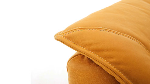 sonnengelber Lederbezug mit einer beigen Kontrastnaht und mattschwarzen Metallfüßen