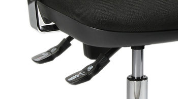 Über die Rastermechanik lässt sich die ergonomisch taillierte Rückenlehne mit integrierter Lendenwirbelstütze in der Höhe verstellen. Auch die Armlehnen sind höhenverstellbar.