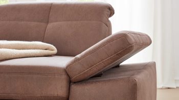 Es kombiniert einen nougatfarbenen Mikrofaserbezug mit Eiche biancofarben gebeizten Holzfüßen. Für erstklassigen Komfort sorgen der Sitz mit einer hochwertigen Federkernpolsterung, die auf einer optimal stützenden Wellenunterfederung gelagert ist, sowie der mit weichem Kaltschaum gepolsterte Rücken.