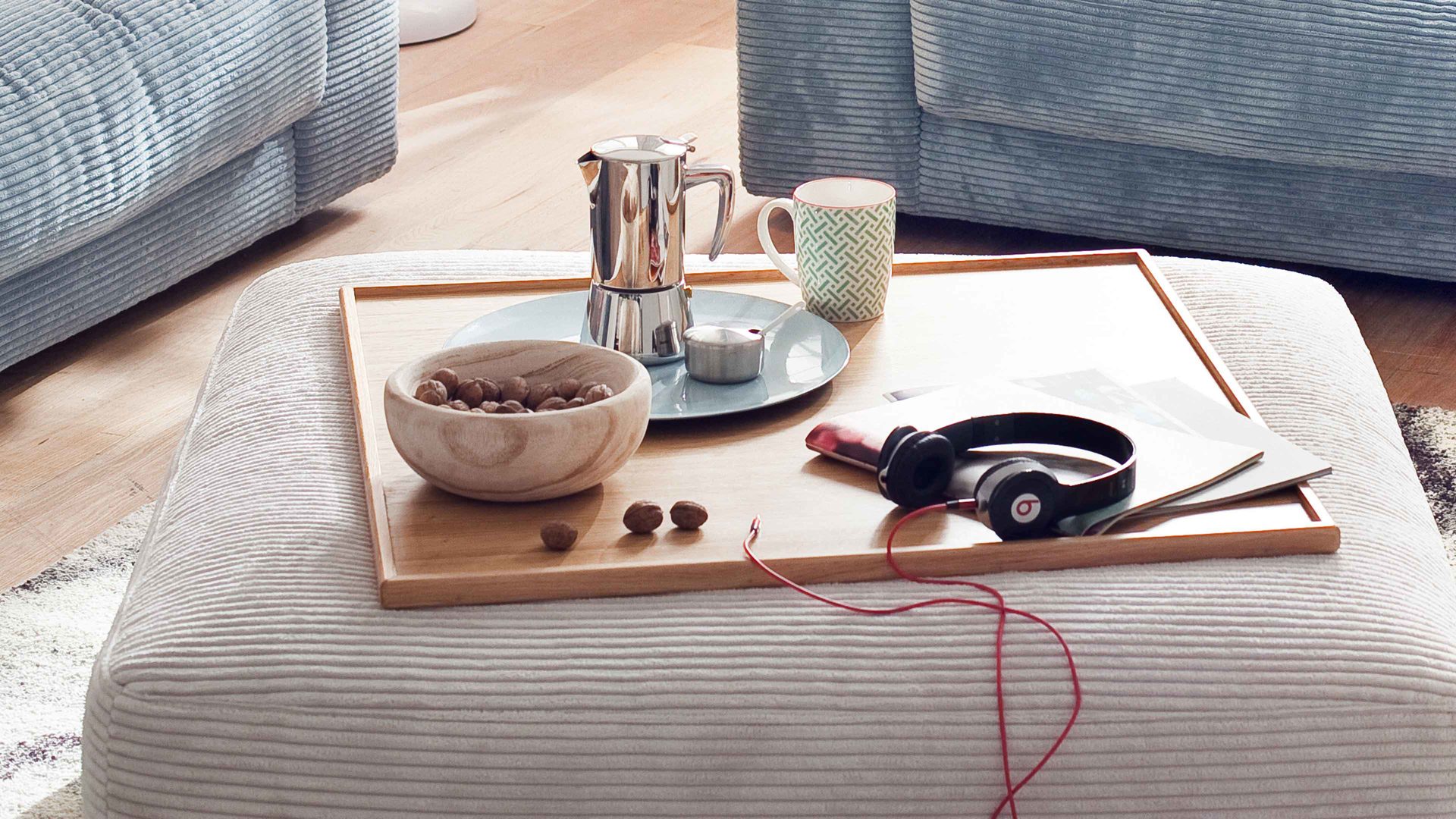Das Armlehn-Tablett ist ein nützliches Zubehör für den Polsterhocker aus dem Polsterprogramm SOFAkultur Seventies.