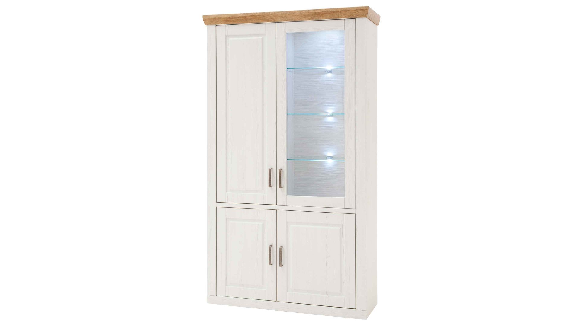 Bei der Vitrine 12 aus dem Wohnprogramm Brixen begeistern sowohl die optischen als auch die funktionalen Merkmale. Sie kombiniert Pinie Aurelio-Nachbildung mit Grandson Oak-Nachbildung. Durch die Farben und die spezielle Frontgestaltung erscheint das Wohnmöbel im angesagten skandinavischen Landhausstil. Eine geschroppte Rückwand, die ebenfalls in Pinie Aurelio-Nachbildung gehalten ist, sorgt zusammen mit dem Klarglaseinsatz für weitere herausragende Akzente. Klassische Metallgriffe runden das ausdrucksstarke Design stilvoll ab.