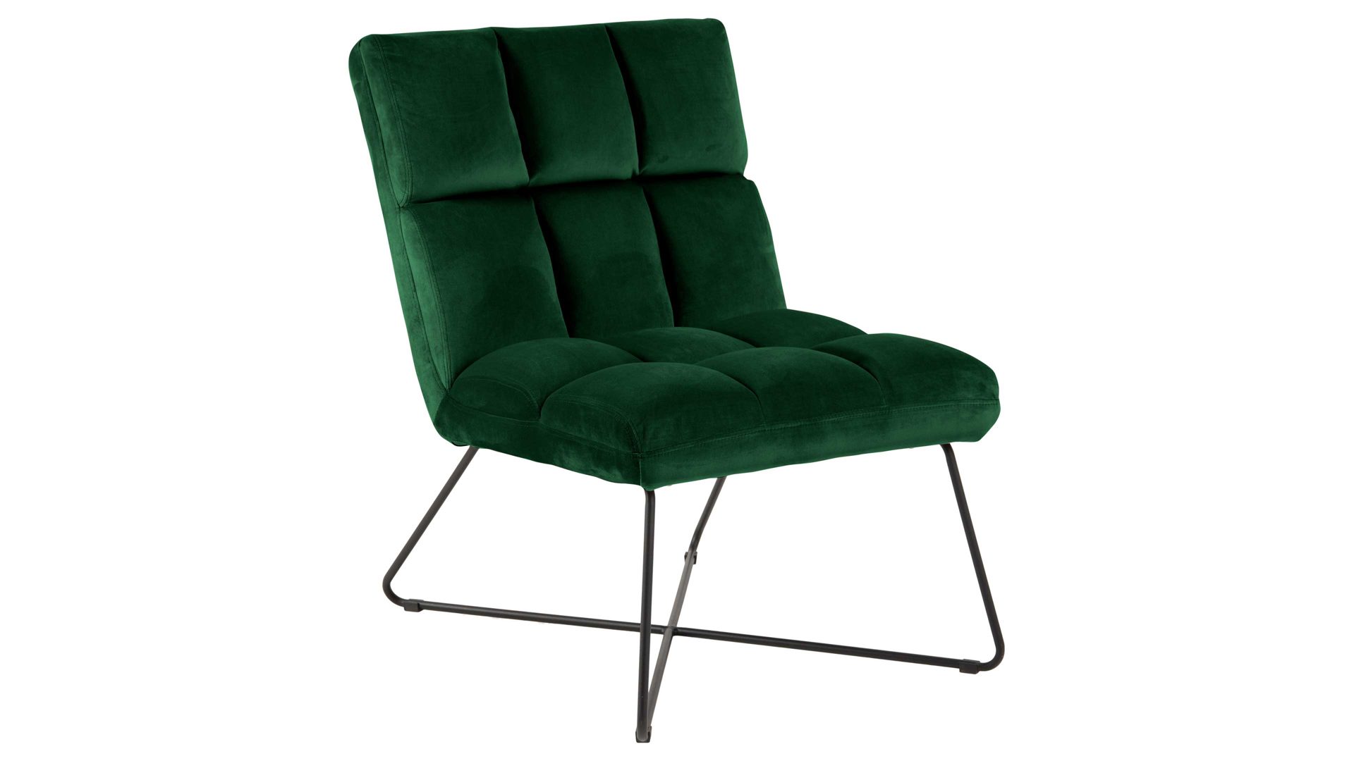 Dabei harmoniert der Polsterstuhl in seiner sanften Formensprache mit zahlreichen Einrichtungsstilen. Moderne Geradlinigkeit ergänzt er ebenso stimmig wie den beliebten Vintage-Trend. In jedem Fall belebt der Relaxstuhl das Interieur durch einen leuchtenden Farbakzent. Dafür sorgt der Samtbezug in Waldgrün. Seine gemütliche Steppung umhüllt sowohl die Sitzfläche als auch die Rückenlehne. Neben dem außergewöhnlichen Farbton erzeugen die gekreuzten filigranen Standfüße einen weiteren Blickfang. Das rau pulverbeschichtete und mattschwarze Metallgestell bildet zum tiefen Grün einen tollen Kontrast.