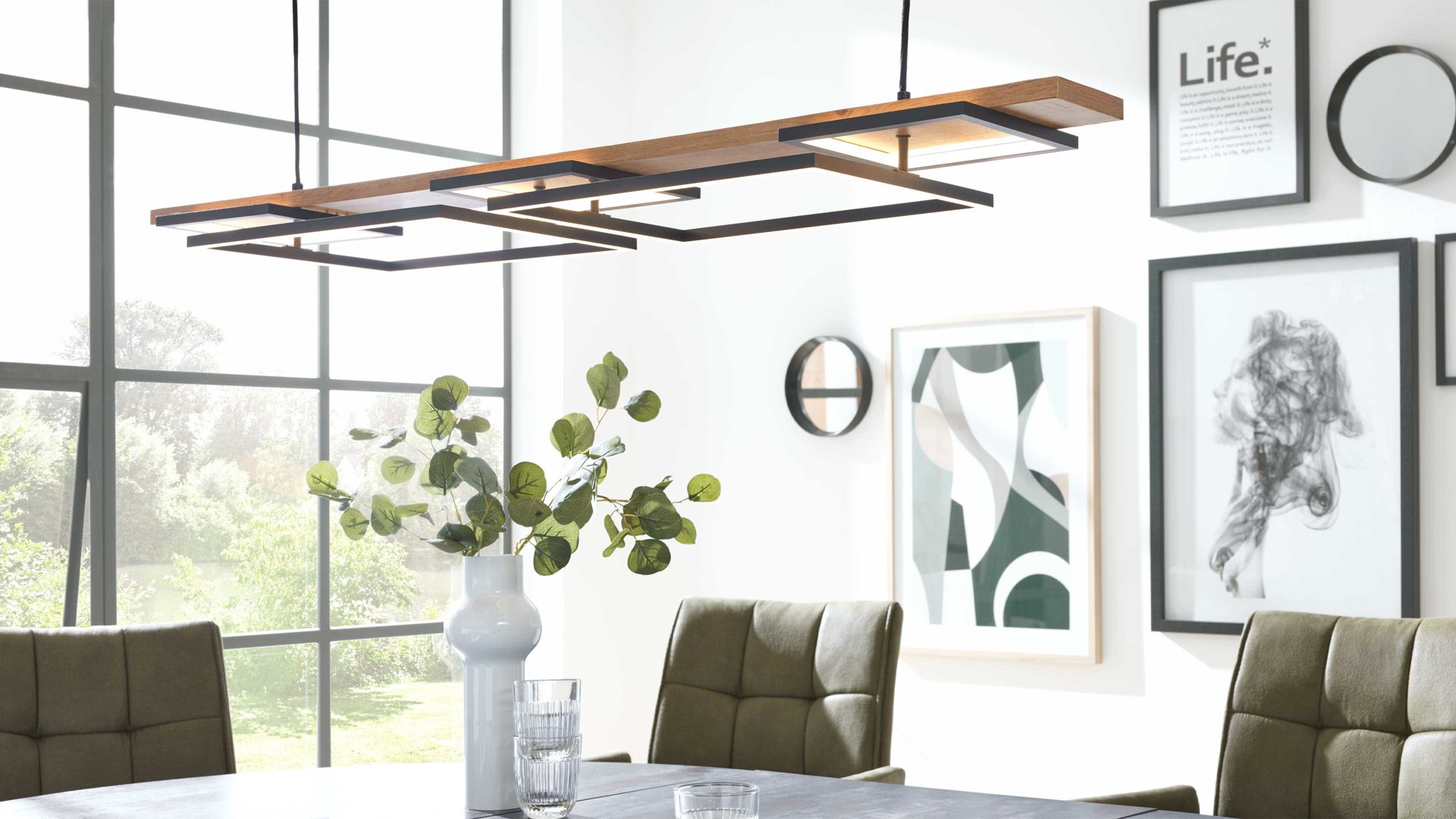 Zwei Rechtecke mit ca. 30 x 40 cm (BxL) und zwei Quadrate mit je ca. 20 x 20 cm (BxL) bilden die markante Form der Esszimmer-Pendellampe. Mit ihren Gesamtmaßen von ca. 125 x 9 x 30 cm (B/LxHxT) und einem ca. 120 cm langen Kabel lässt sich die Leuchte flexibel in verschiedenste Raumhöhen integrieren – ideal über dem Esstisch oder in großzügigen Wohnzonen.
