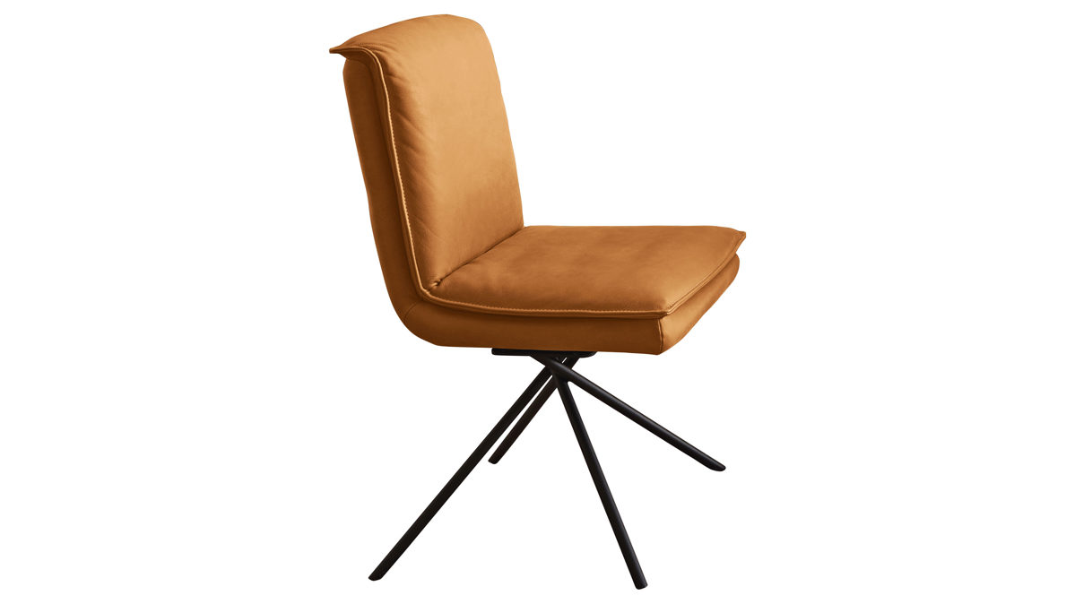 sonnengelber Lederbezug mit einer beigen Kontrastnaht und mattschwarzen Metallfüßen