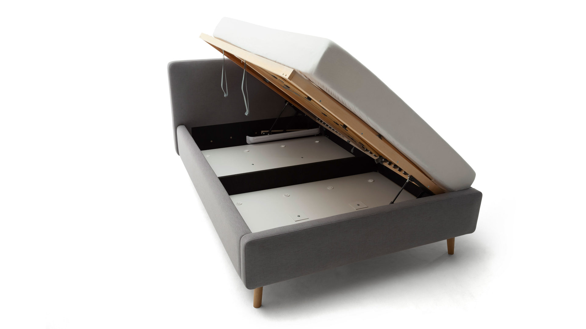 Im Lieferumfang des Bettgestells ist ein hochwertiger Lattenrahmen enthalten, der 28 Federholzleisten mit Härtegradverstellung aufweist. Klappen Sie den Lattenrahmen seitlich hoch, um sich Zugang zum Bettkasten mit Gasdruckdämpfer zu verschaffen. In dem geräumigen Kasten können Sie etwa Bettzubehör wie Kissen und Decken sowie viele sonstige Utensilien praktisch platzsparend aufbewahren.
