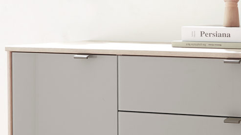 | Farbhinweis: | Kieselgrau Nordic Eiche silbergraues Streifendekor (Innenseiten) Schiefer (Griffe) | |