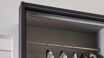 Die Serie Denver bietet Ihnen eine Vielzahl an Möglichkeiten, um Ihr Schlafzimmer individuell zu gestalten.Die Dreh- und Schwebetürenschränke sind in acht Breiten und zwei Höhen erhältlich. So können Sie den Schrank optimal an Ihre Bedürfnisse anpassen. Die Drehtüren haben einen Öffnungswinkel von 105° und somit haben Sie einen bequemen Zugang zu Ihrem Kleiderschrank. Die Scharnierdämpfung sorgt für ein sanftes und leises Schließen der Türen. Die Metallbeschläge gewährleisten eine lange Lebensdauer des Schrankes. Die Hartfaserrückwände sorgen für zusätzliche Stabilität und Langlebigkeit. Zusätzliches Schrankzubehör und Beimöbel sind optional erhältlich, um den Stauraum noch weiter zu optimieren.