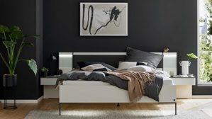 Zum Bett gehören ein zweiteiliges Hängekonsolen-Set (Typ B20115) mit weißen Glasfronten und mattweißem Korpus, je eine Schublade mit Vollauszug und Softclose. Maße: ca. 60 x 48 x 43 cm (B/LxHxT). Ein zweiteiliges Paneel-Set (Typ 20183) mit mattweißer Rückwand und weißen Glaseinsätzen. Maße: ca. 30 x 48 x 4 cm (B/LxHxT). Eine zweiteilige LED-Rückwandbeleuchtung (Typ B20113), je ca. 28 x 1 x 1 cm (B/LxHxT), mit Kippschalter und LED-Leuchtmittel der Energieeffizienzklasse F (Spektrum A bisG). Die LED-Kopfteilbeleuchtung (Typ B20117) mit Kippschalter am Kopfteil, LED-Leuchtmittel der Energieeffizienzklasse E (Spektrum A–G) und das zweiteilige Beleuchtungs-Set (Typ B202117) für das Fußteil, je ca. 55 x 9 x 9 cm (B/LxHxT), LED-Leuchtmittel der Energieeffizienzklasse E. Wichtig: Alle Beleuchtungen sind nicht nachträglich einbaubar und müssen direkt bei der Planung berücksichtigt werden.