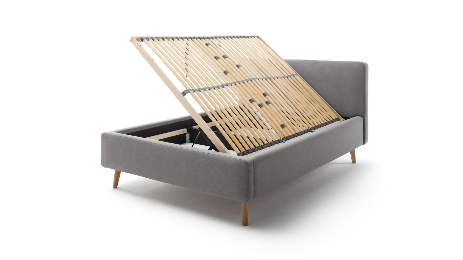 Im Lieferumfang des Bettgestells ist ein hochwertiger Lattenrahmen enthalten, der 28 Federholzleisten mit Härtegradverstellung aufweist. Klappen Sie den Lattenrahmen seitlich hoch, um sich Zugang zum Bettkasten mit Gasdruckdämpfer zu verschaffen. In dem geräumigen Kasten können Sie etwa Bettzubehör wie Kissen und Decken sowie viele sonstige Utensilien praktisch platzsparend aufbewahren.