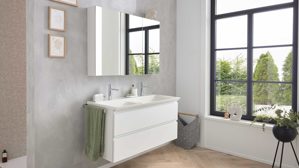 Der dazugehörige Doppelwaschtisch aus weißem evermite® überzeugt durch seine kratzunempfindliche, verfärbungsresistente und besonders pflegeleichte Oberfläche. Mit zwei Hahnlochbohrungen und einem verchromten CLOU Ab- und Überlaufsystem bietet er höchsten Komfort und elegantes Design in einem. Armaturen lassen sich individuell ergänzen – ganz nach deinem Geschmack.