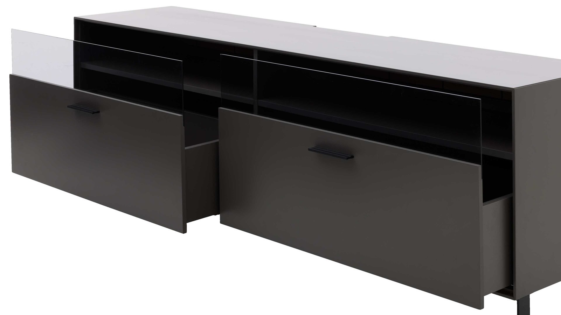 Das Lowboard aus der Interliving Wohnzimmer Serie 2030 verbindet stilvolle Ästhetik mit hochwertiger Verarbeitung – perfekt für ein modernes Wohnzimmer mit Anspruch. Die wolframgrauen Lackoberflächen verleihen dem Möbelstück eine edle, ruhige Ausstrahlung. Graue Parsolglaseinsätze, sichtbare Rückwände mit Spaltholz auf schwarzer MDF und Metallelemente in feinstrukturiertem Schwarzlack setzen dezente, aber wirkungsvolle Akzente, die dem Design Tiefe und Charakter verleihen.