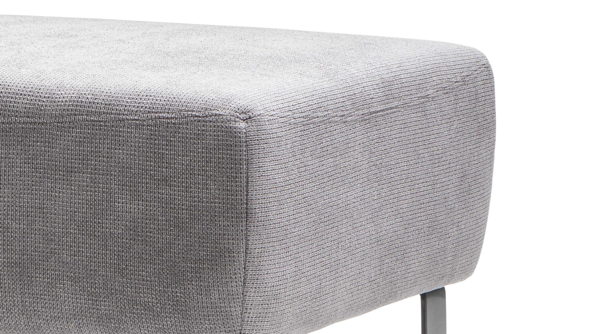 Der moderne Hocker Dana kombiniert einen stilvollen steinfarbenen Stoffbezug mit mattschwarz lackierten Metallkufen und strahlt schlichte Eleganz aus. Dadurch fügt er sich in unterschiedliche Wohnstile stimmig ein.
