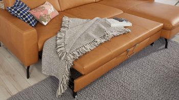 Die lederbezogene Liegefläche ist ein Mehrpreis für die Möbel mit Bettfunktion aus dem Modulmaster-Polsterprogramm MM-PN1126. Durch dieses Extra präsentiert sich die Liegefläche im Originalbezug des jeweiligen Sofas. Das kurkumafarben pigmentierte Glattleder präsentiert sich modern und elegant.