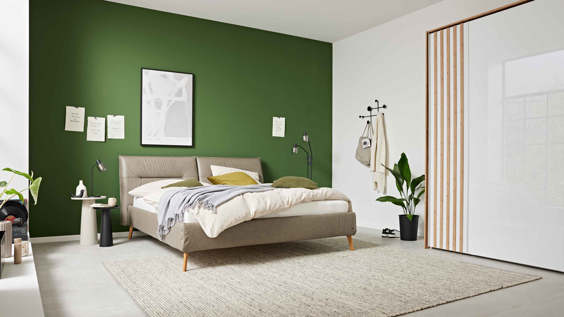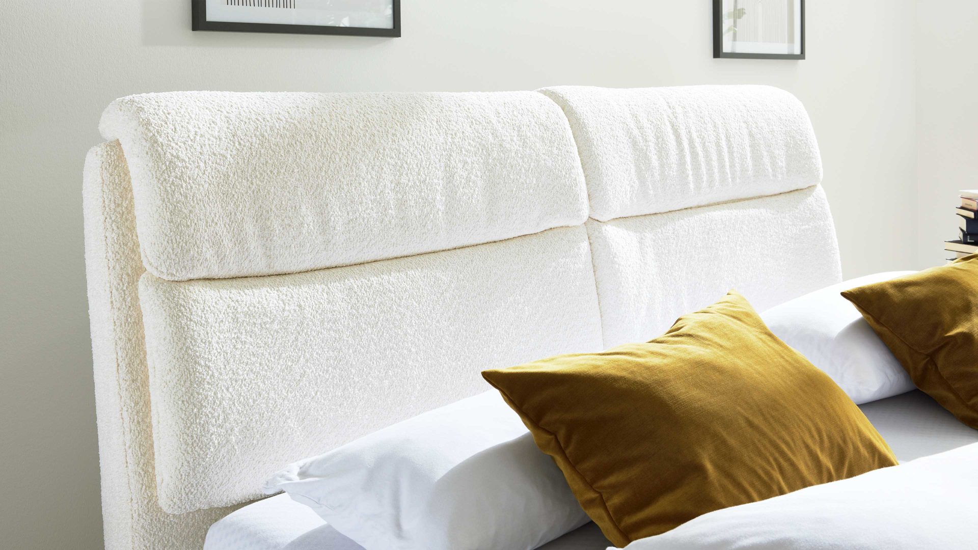 Wenn du dein Bett frei im Raum platzieren möchtest, empfiehlt sich die Ausführung mit rückseitigem Originalbezug. So wirkt dein Schlafzimmer offener und moderner. Helle Stoffe wie Naturweiß lassen Räume zusätzlich größer und ruhiger wirken.