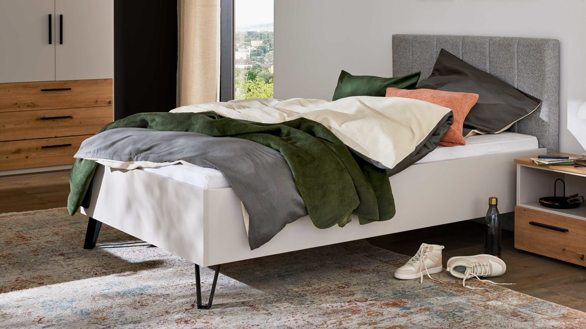 Das Bettgestell aus der Interliving Jugendzimmer Serie 1702 verbindet modernes Design mit funktionaler Flexibilität und ist ideal für ein Jugendzimmer, das sich den Bedürfnissen im Alltag anpasst. Sandgraue Bettseiten, ein graues Polsterkopfteil und mattschwarze Metallfüße sorgen für eine zeitlose, ruhige Optik, die sich vielseitig kombinieren lässt. Die komfortable Liegefläche von ca. 120 x 200 cm (BxL) bietet ausreichend Platz zum Schlafen, Lesen und Entspannen.
