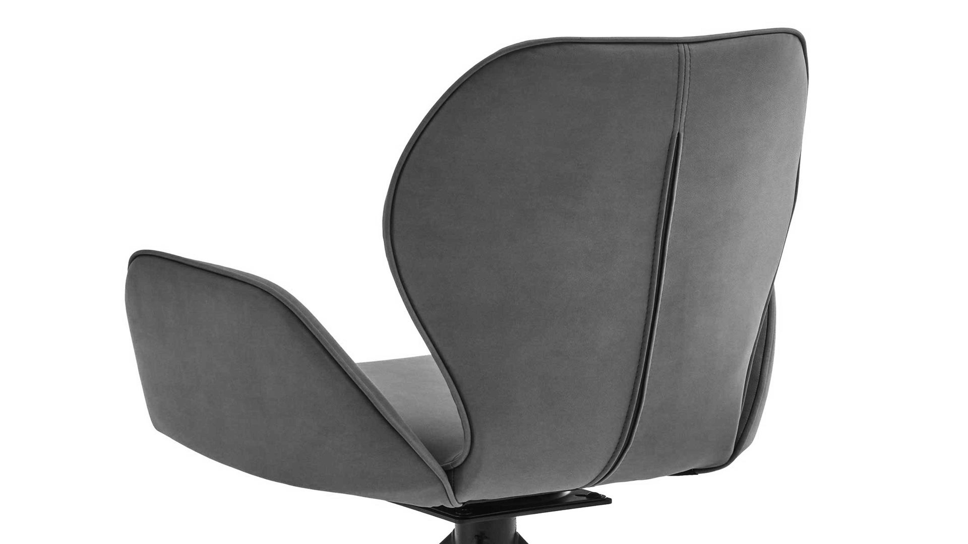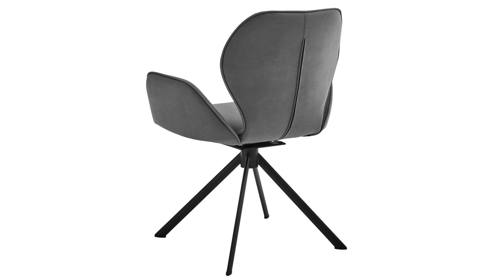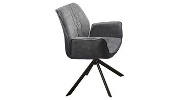 Er kombiniert ein mattschwarz lackiertes Stativgestell aus robustem Eisen mit einem silberfarbenen Mikrofaserbezug in Lederoptik und fügt sich in verschiedene Wohnstile harmonisch ein. Zu den optischen Highlights des Esszimmerstuhls gehört neben der Formensprache und den perfekt aufeinander abgestimmten Farben der markante Quereinzug im Rücken. Praktisch begeistern die Drehbarkeit um 180 Grad mit Rückholfunktion sowie die bodenschonenden Gleiter am Gestell.