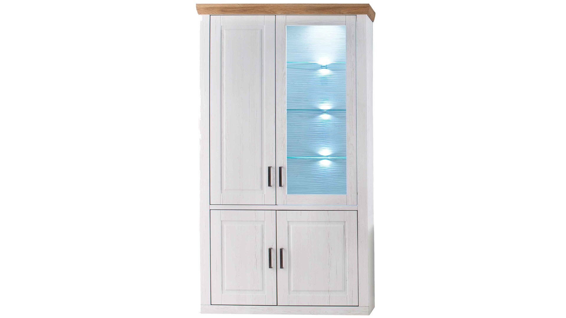 Bei der Vitrine 12 aus dem Wohnprogramm Brixen begeistern sowohl die optischen als auch die funktionalen Merkmale. Sie kombiniert Pinie Aurelio-Nachbildung mit Grandson Oak-Nachbildung. Durch die Farben und die spezielle Frontgestaltung erscheint das Wohnmöbel im angesagten skandinavischen Landhausstil. Eine geschroppte Rückwand, die ebenfalls in Pinie Aurelio-Nachbildung gehalten ist, sorgt zusammen mit dem Klarglaseinsatz für weitere herausragende Akzente. Klassische Metallgriffe runden das ausdrucksstarke Design stilvoll ab.