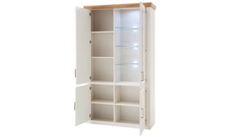 Der Vitrinenschrank mit Maßen von ca. 118 x 210 x 40 cm (BxHxT) weist vier Türen auf - drei reine Holztüren und eine Tür mit großzügigem Glaseinsatz. Im Inneren der Holztürenelemente befinden sich insgesamt vier Holzböden, während die Glastür drei Glasböden beherbergt. Demnach bietet die Standvitrine eine Menge Stauraum für verschiedene Gegenstände, die Sie licht- und staubgeschützt aufbewahren wollen. Hinter dem Glaseinsatz setzen Sie Dekoratives perfekt in Szene, etwa edles Geschirr oder Erinnerungsstücke, die Ihnen am Herzen liegen.