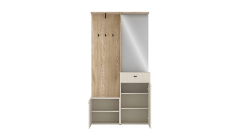 Das Set besteht aus einem Garderobenschrank mit einer Tür und einem Schubkasten und einer Bank mit Tür. Hinter den Türen befinden sich insgesamt drei Einlegeböden, die großzügigen Stauraum für Schuhe, Taschen oder Alltagsgegenstände bieten. Die Schublade mit kugelgelagerter Führung lässt sich leichtgängig öffnen und schließen – ideal für Schlüssel, Handschuhe oder Accessoires.