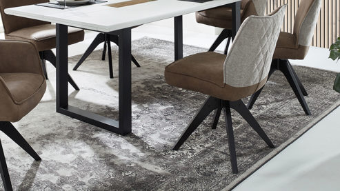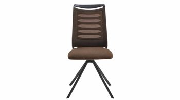 Er kombiniert ein mattschwarz lackiertes Stativgestell aus robustem Eisen mit einem taupefarbenen Mikrofaserbezug in Lederoptik und fügt sich in verschiedene Wohnstile harmonisch ein. Zu den optischen Highlights des Esszimmerstuhls gehört neben der Formensprache und den perfekt aufeinander abgestimmten Farben der markante Quereinzug im Rücken. Praktisch begeistern die Drehbarkeit um 180 Grad mit Rückholfunktion sowie die bodenschonenden Gleiter am Gestell.