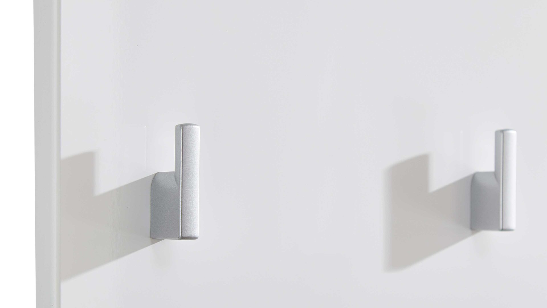 Verleihen Sie mit diesem Garderobenpaneel Ihrem Eingangsbereich eine einladende Atmosphäre und schaffen Sie gleichzeitig eine stilvolle Möglichkeit zur ordentlichen Kleideraufbewahrung. Die Wandgarderobe präsentiert sich mit einem Korpus aus MDF mit weißer Hochglanzoberfläche und auffällig schöner Rillenfräsung. Dabei bieten der Ablageboden, die Kleiderstange sowie drei Kleiderhaken ausreichend Platz für Ihre Kleidung. Jacken, Schals und Mäntel hängen Sie knitterfrei auf, während Sie Hüte und Mützen auf der oberen Ablagefläche des Dielenmöbels verstauen.