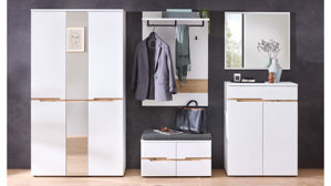 • Die Abbildung zeigt ein Wohnbeispiel, welches auch Dekoration sowie separat erhältliches Zubehör enthält. Im Lieferumfang enthalten ist ein fünfteiliges Garderoben-Set.