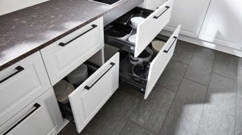 Die Interliving Küche Serie 3045 verbindet klassische Schlichtheit mit modernen Details. Ihre softmatten weißen Fronten wirken zeitlos elegant und harmonieren perfekt mit den premiumweißen Korpussen und Sockelblenden. Für spannende Kontraste sorgen die Arbeitsplatten im Farbton Terra Mare sowie die schwarzen Griffe und der schwarze Tresen, die dem Design eine stilvolle Landhausnote verleihen.