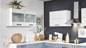 Die Fronten dieser pino Einbauküche sind hauptsächlich in edlem Pastellblau designt, kombiniert mit puristischem Weiß. Auch die Korpusseiten, Sockelblenden und Arbeitsplatten präsentieren sich in Weiß. Einen gelungenen Akzent setzen die Milchglas-Einsätze bei den Hängeschränken. Edelstahlfarbene Metall-Bügelgriffe runden die modern-elegante Optik stilvoll ab.