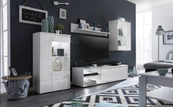 Die Wohnwand ist im Korpus weiß,