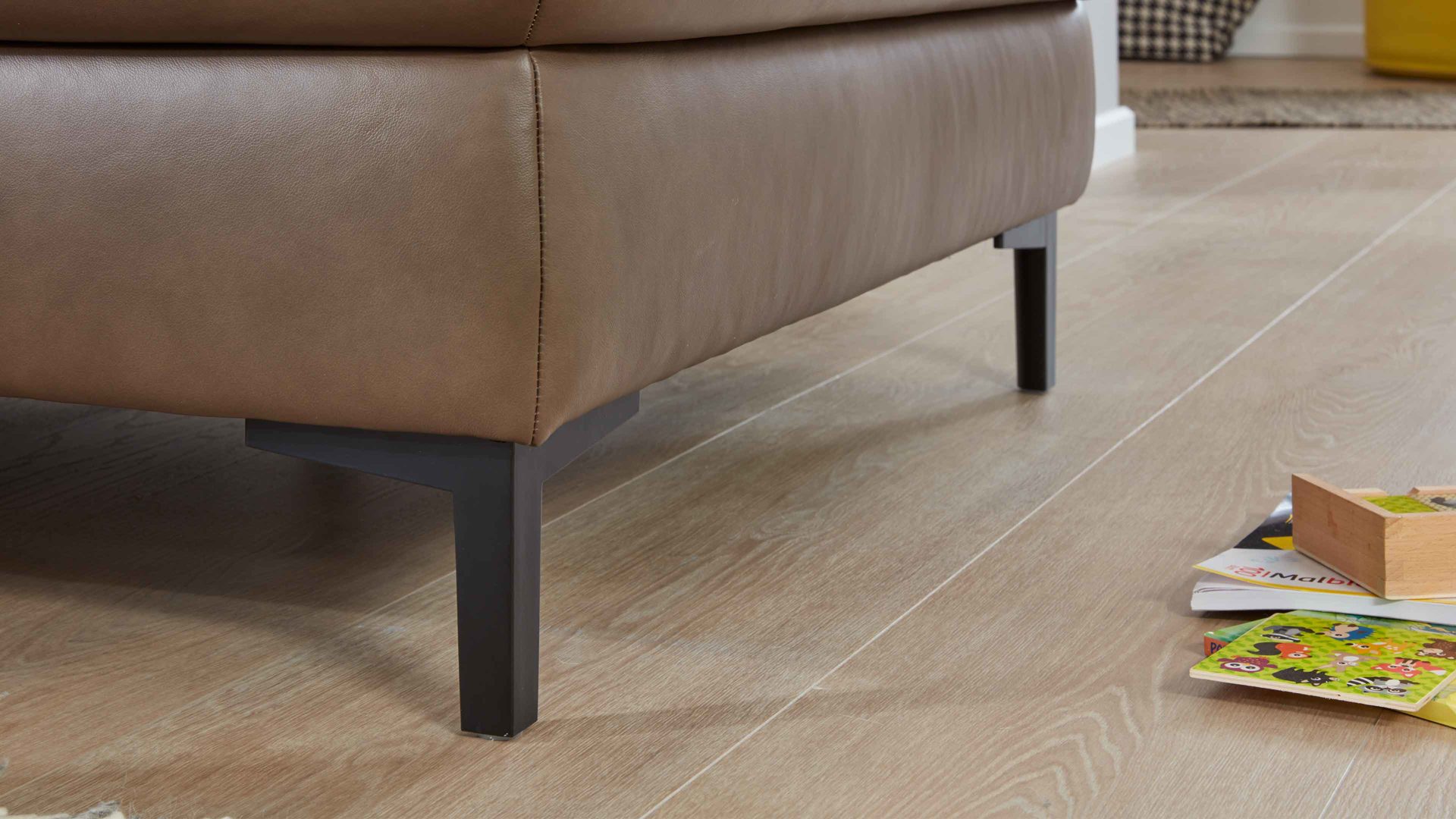 Das Ecksofa aus dem Modulmaster-Polsterprogramm MM-PN1137 kombiniert steinfarben pigmentiertes Glattleder mit mattschwarzen Metall-Profilfüßen. Es präsentiert sich modern und elegant.