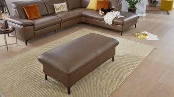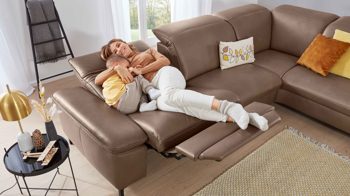 Für herausragenden Komfort sorgen neben der angenehmen Haptik des Leders die feste Federkernpolsterung auf einer stützenden Wellenunterfederung im Sitz und die mit softem Kaltschaum gepolsterten Rückenlehnen. Darüber hinaus sind die Kopfpolster manuell mittels Rasterbeschlag mehrfach verstellbar. Je nach Kopfpolstereinstellung variiert die Gesamthöhe des Sofas von ca. 85 bis 110 cm.