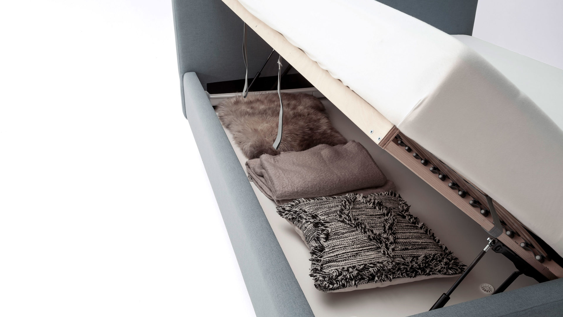 Im Lieferumfang des Bettgestells sind zwei hochwertige Lattenrahmen enthalten, die jeweils 28 Federholzleisten mit Härtegradverstellung aufweisen. Klappen Sie die Lattenrahmen seitlich hoch, um sich Zugang zu den Bettkästen mit Gasdruckdämpfer zu verschaffen. In den geräumigen Kästen können Sie etwa Bettzubehör wie Kissen und Decken sowie viele sonstige Utensilien praktisch platzsparend aufbewahren.