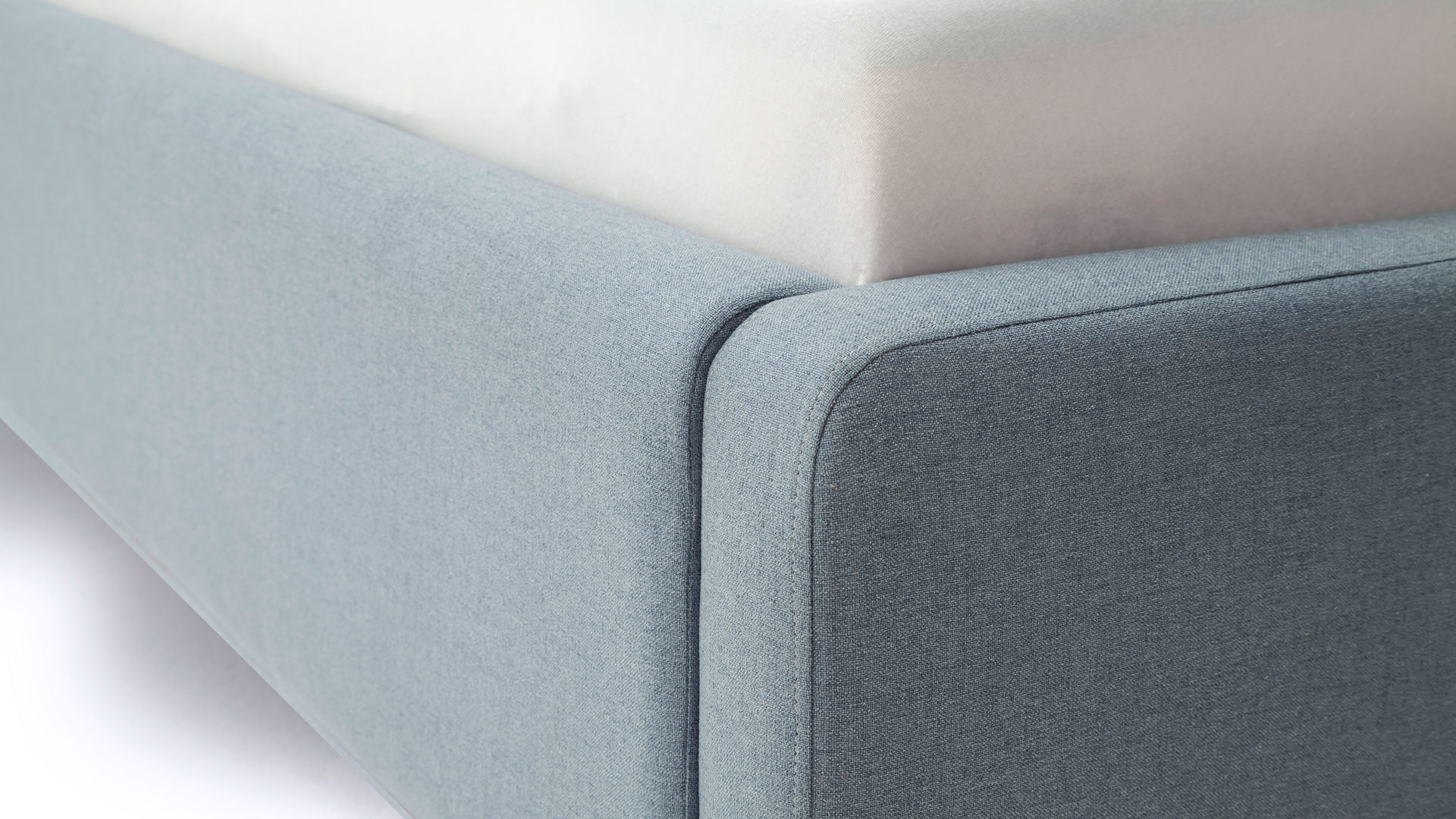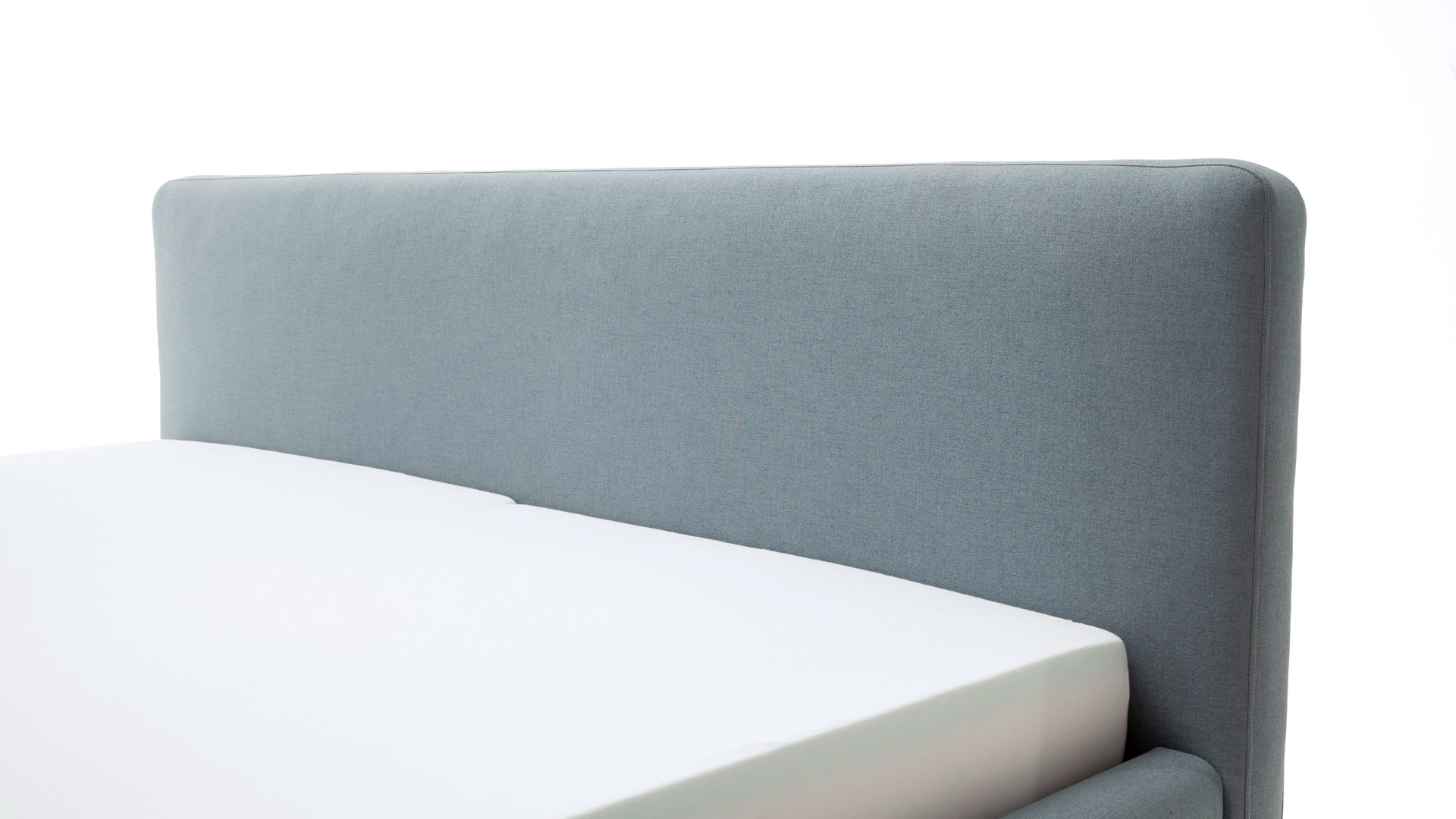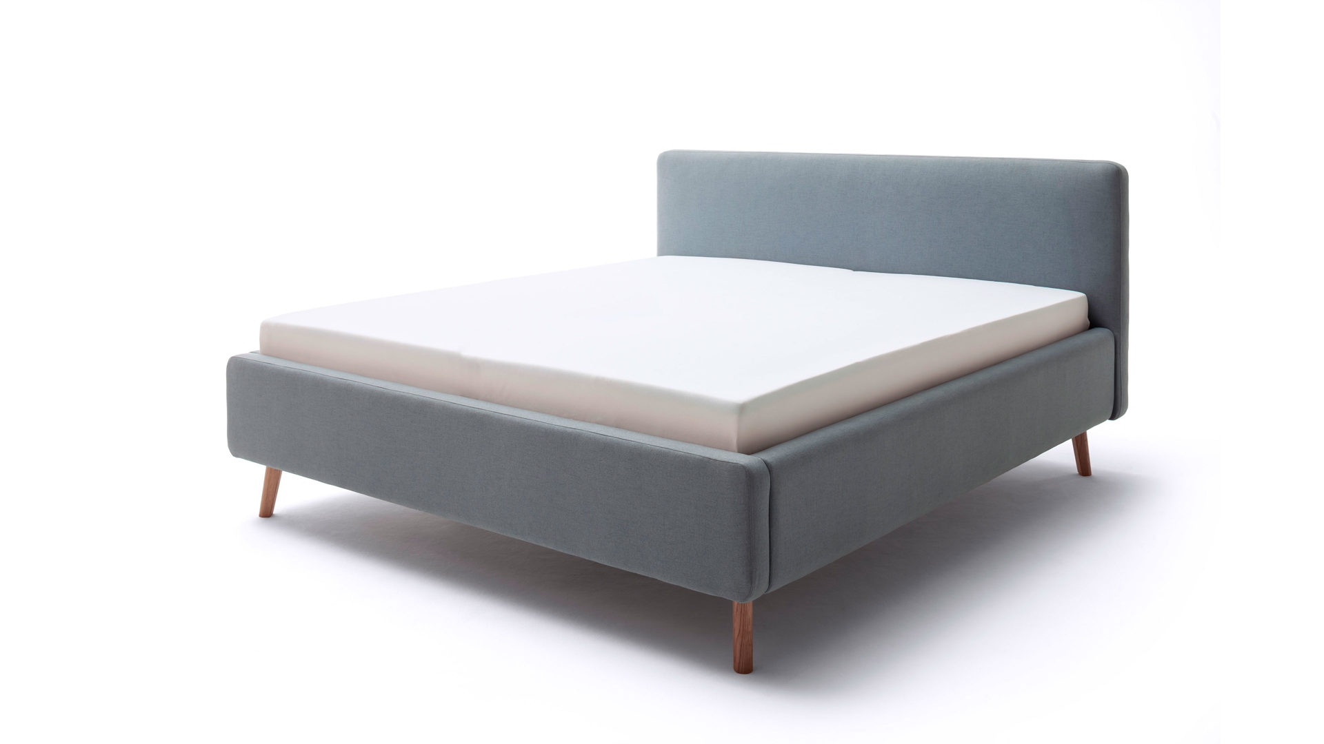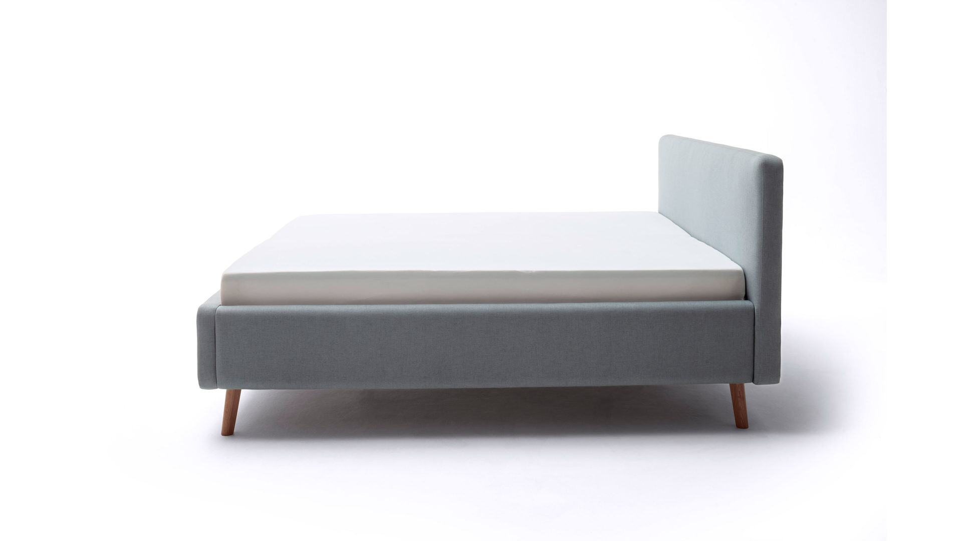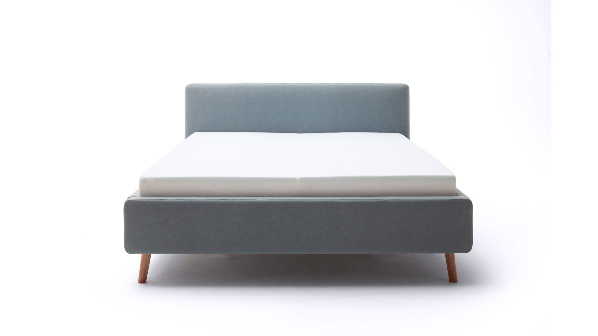 Das Polsterbettgestell Mattis begeistert durch die elegante Optik sowie die hervorragende Material- und Verarbeitungsqualität. Es kombiniert einen eisblauen Flachgewebe-Bezug mit eichefarbenen Holzfüßen. Sowohl die Bettseiten als auch das Polsterkopfteil sind glatt bezogen. Letzteres lädt Sie ein, sich anzulehnen, wenn Sie abends im Bett vor dem Schlafen noch fernsehen oder in einem Buch lesen.