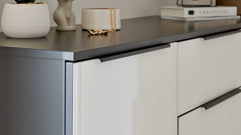 Die Kommode aus der Interliving Schlafzimmer Serie 1210 überzeugt durch ihr edles Design und ihre praktische Ausstattung. Die Fronten mit seidengrauen Glasauflagen strahlen moderne Ruhe aus, während der basaltfarben lackierte Korpus für Tiefe und Harmonie sorgt. Anthrazitfarbene Metallgriffe runden das hochwertige Gesamtbild stilvoll ab.