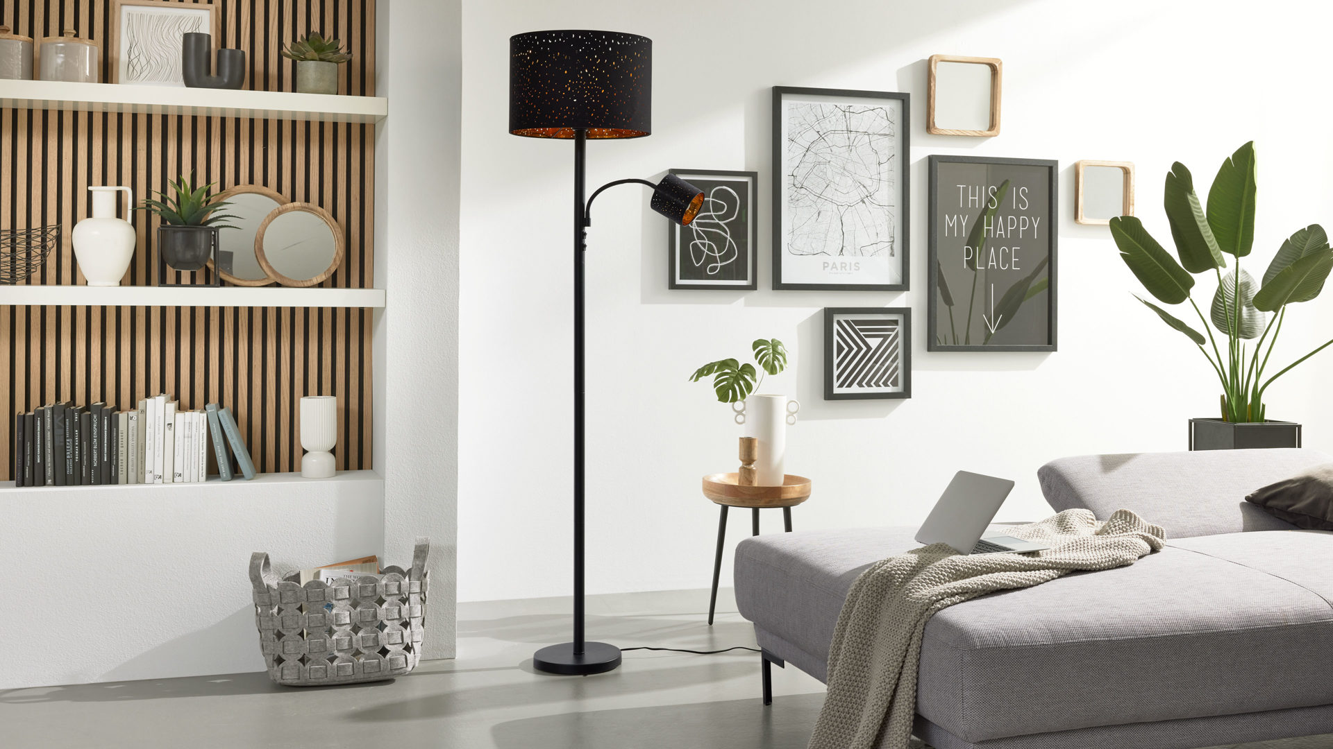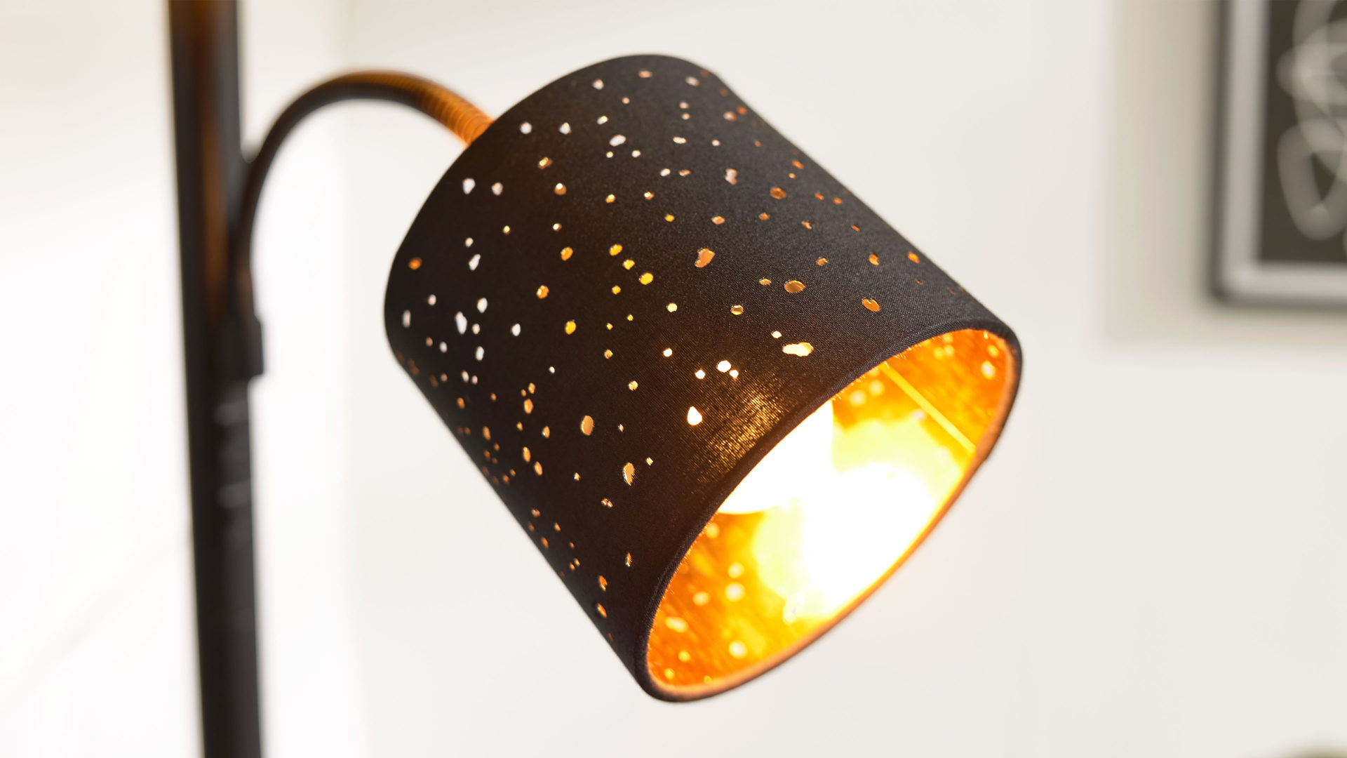 Die moderne Stehleuchte aus der Interliving Leuchten Serie 9343 umfasst einen großen und einen kleinen schwarzen Textillampenschirm mit Dekorstanzung für einen romantischen Sterneneffekt.