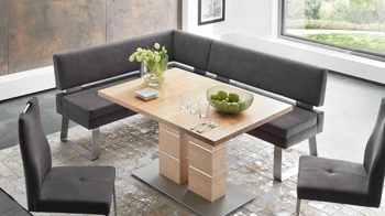 Mit ihren designspezifischen Eigenschaften bereichert die Küchenbank Ihren Speisebereich in jeder Hinsicht. Die Stellfläche beziehungsweise das Schenkelmaß beläuft sich auf ca. 202 x 152 cm (LxB). Im Shop sind ergänzend ein Schwingstuhl sowie ein Esstisch des Programms erhältlich, sodass Sie Ihre Essecke harmonisch gestalten können.