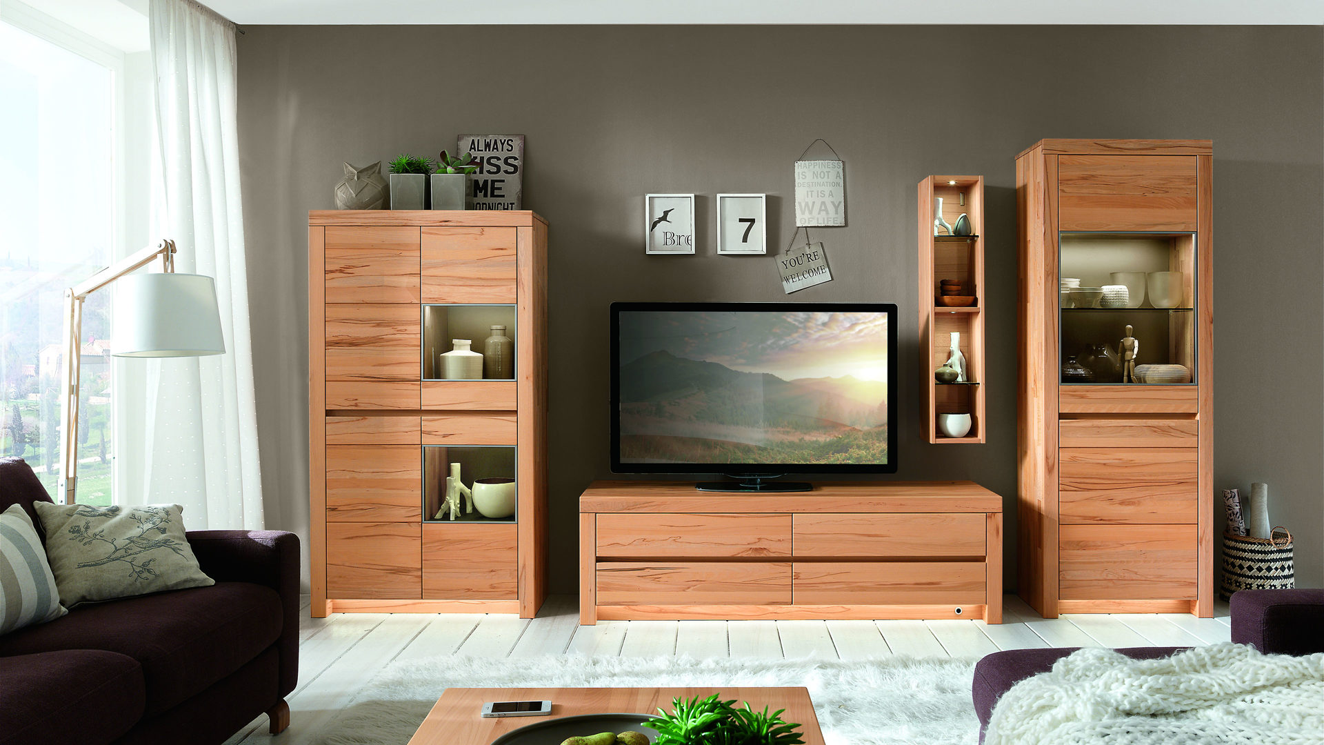 Der warme Holzton des Aufbewahrungsmöbels Made in Germany lässt sich hervorragend mit vielen Farben kombinieren.