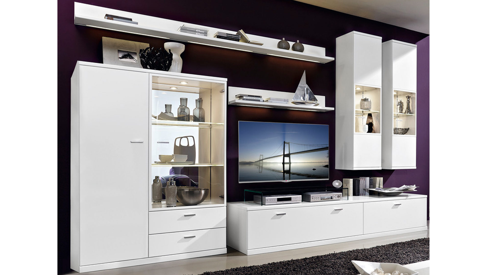 Die stilvoll gestaltete und erstklassig verarbeitete Wohnkombination besteht aus einem Schrank, einem Vitrinenschrank, einem Wandspiegel, einem Unterteil, zwei Wandboards und zwei Hängeschränken. Beim eintürigen Schrank mit drei Einlegeböden belaufen sich die Maße auf ca. 45 x 148 x 39 cm (BxHxT). Der ebenfalls eintürige Vitrinenschrank begeistert durch den Glaseinsatz. Er beherbergt zwei Glasböden und im unteren Bereich zwei Schubladen. Mit dem ca. 75 x 76 x 5 cm (BxHxT) großen Wandspiegel integriert die Wohnkombination ein dekoratives Extra. Das Unterteil mit Auszug misst ca. 90 x 40 x 55 cm (BxHxT). Auf den beiden Wandboards bringen Sie schöne Accessoires perfekt zur Geltung. Ihre Maße liegen bei ca. 225 x 17 x 19 cm (BxHxT) und ca. 105 x 17 x 19 cm (BxHxT). Zusätzliche Stauräume schaffen die zwei eintürigen Hängeschränke, die edle Glaseinsätze sowie einen Glas- und drei Holzböden offenbaren. Sie sind ca. 38 x 146 x 35 cm (BxHxT) groß. Insgesamt betragen die Maße der gigantischen Wohnwand ca. 225 x 216 x 55 cm (BxHxT).