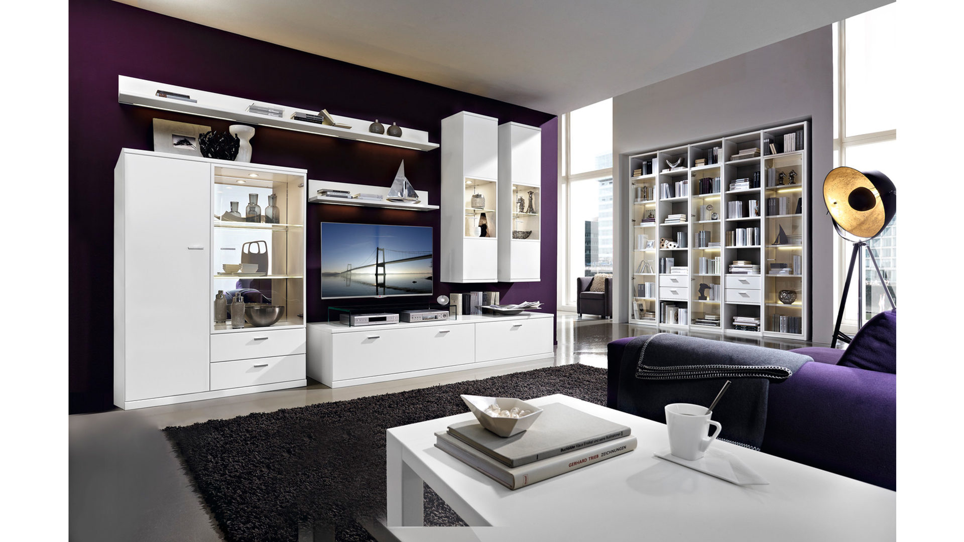 Die Möbel der Vancouver Wohnkombination präsentieren sich mit Lackoberflächen in klassisch-elegantem Mattweiß. Durch die klare, helle Farbgebung strahlt die Wohnwand herrlich-puristischen Charme aus. Für eine stimmig-moderne Abrundung sorgen die matt verchromten Metallgriffe.
