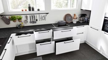 Die Interliving Küche Serie 3045 verbindet klassische Schlichtheit mit modernen Details. Ihre softmatten weißen Fronten wirken zeitlos elegant und harmonieren perfekt mit den premiumweißen Korpussen und Sockelblenden. Für spannende Kontraste sorgen die Arbeitsplatten im Farbton Terra Mare sowie die schwarzen Griffe und der schwarze Tresen, die dem Design eine stilvolle Landhausnote verleihen.