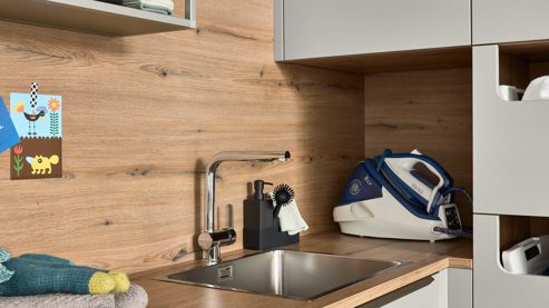 Kombiniere die Hauswirtschaftsmöbel mit passenden Vorratsraumelementen oder erweitere sie um zusätzliche Stauraumlösungen, um noch mehr Struktur in dein Zuhause zu bringen.