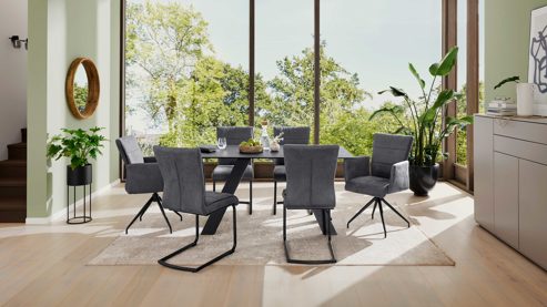 Für ein harmonisches Gesamtbild bietet die Serie optimal abgestimmte Stühle. Du kannst zwischen drei stilvollen Steppungsvarianten wählen und aus zahlreichen Mikrofaserbezügen in modernen Farben deinen Favoriten bestimmen. Bei den Gestellen stehen Stativ-, Vierfuß- oder Schwinggestell in Schwarz oder Edelstahl zur Verfügung. Optional kannst du dich für Armlehnstühle mit Dreh- und Rückstellfunktion entscheiden – ideal für mehr Bewegungsfreiheit und noch höheren Sitzkomfort.