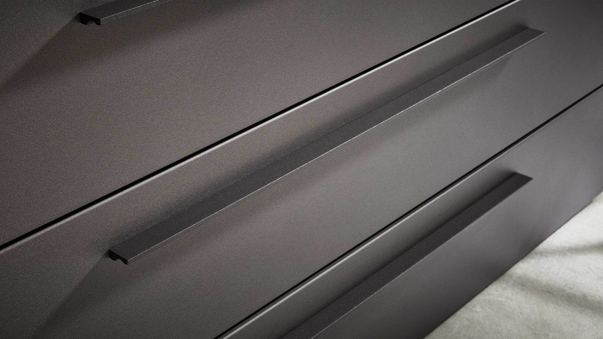 Die Schubladenkommode aus der Interliving Schlafzimmer Serie 1025 kombiniert trendig-graphitfarbenen Mattlack mit robuster Balkeneiche gehackt. So entsteht ein moderner Look mit natürlichem Charakter. Graphitfarbene Metallgriffe mit Eisenglimmerlack setzen dezente Akzente. Die grifflose Holzfront mit push-to-open-Funktion sorgt für ein ruhiges und aufgeräumtes Gesamtbild.