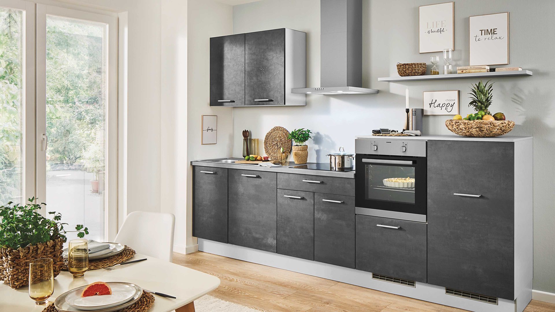 • Die Abbildung zeigt ein Wohnbeispiel, welches auch Dekoration sowie separat erhältliches Zubehör enthält. Im Lieferumfang enthalten sind eine Kücheninsel und eine Hochschranklösung.