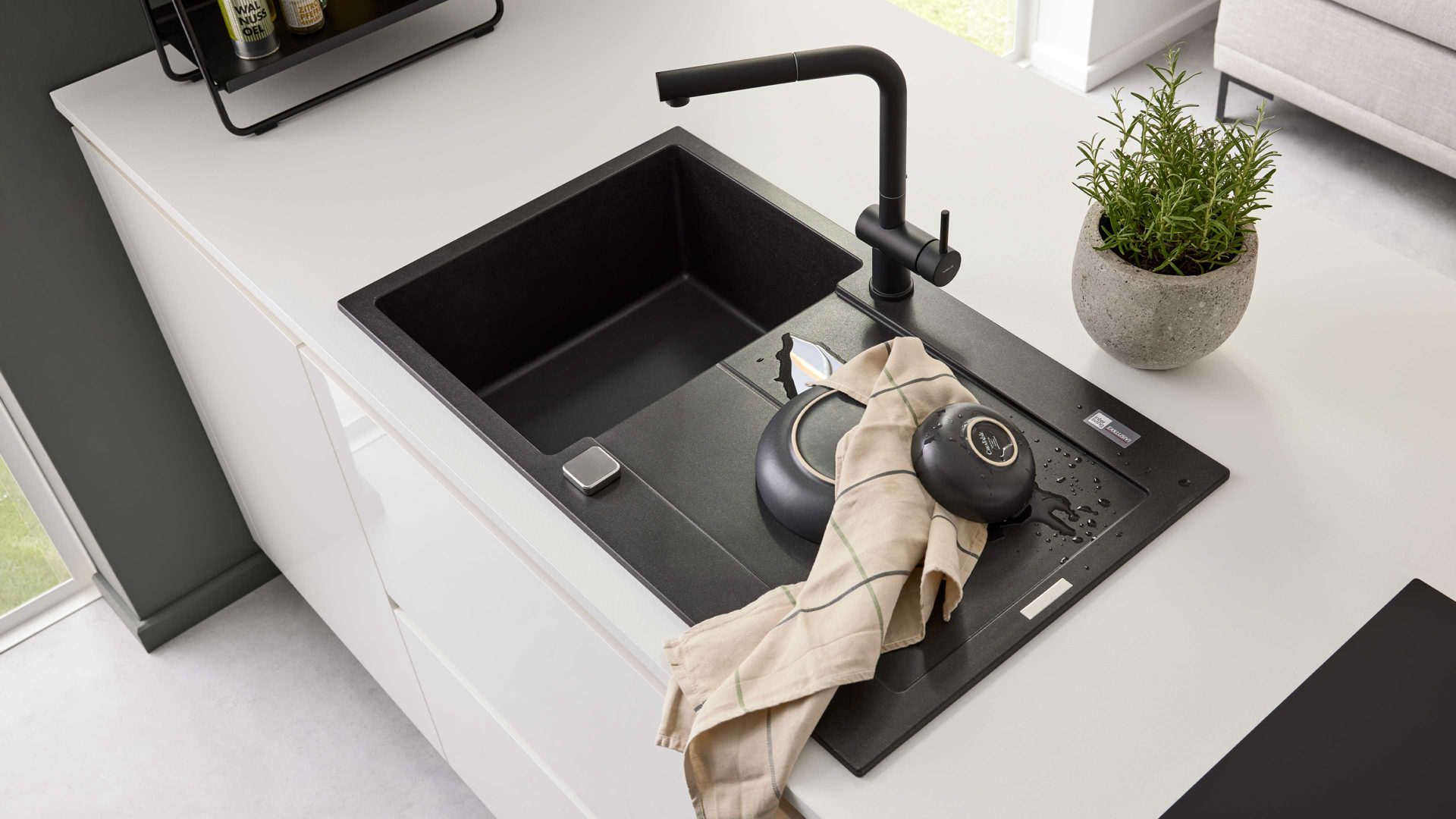 Zur Ausstattung gehören mehrere leistungsstarke Geräte von AEG, die modernes Kochen besonders komfortabel machen. Dazu zählen der Kühlschrank SD124ES mit der Energieeffizienzklasse E (Spektrum A bis G), der Steambake-Backofen BD31M mit einer Breite von ca. 60 cm und der Energieeffizienzklasse A (Spektrum A+++ bis D) sowie der TermaCook Muldenlüfter ML80-STYLO-U mit der Energieeffizienzklasse A+ (Spektrum A+++ bis D). Ergänzt wird das Ganze durch eine mattschwarze Einbauspüle samt passender Einhebel-Mischbatterie. Optional kannst du die Küche gegen Mehrpreis um einen leistungsstarken Geschirrspüler erweitern.