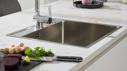 Hier findest du Hängeschränke mit grifflosen Fronten sowie ein offenes Regal für Dekoratives oder Alltägliches. Die übertiefe Arbeitsplatte lässt sich ideal auch als Tresen nutzen. Ein hochwertiges Edelstahlbecken und eine verchromte Einhand-Mischbatterie machen den Bereich komplett.