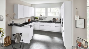Die Interliving Küche Serie 3089 kombiniert klare Linien, hochwertige Materialien und viel Stauraum auf ca. 480 cm Länge inklusive Hängeschränken und ca. 220 cm Tiefe. Mattweiße Melaminfronten, weiße Korpusse und Arbeitsplatten in Marmor Bianco Nachbildung erzeugen einen hellen, modernen Look.