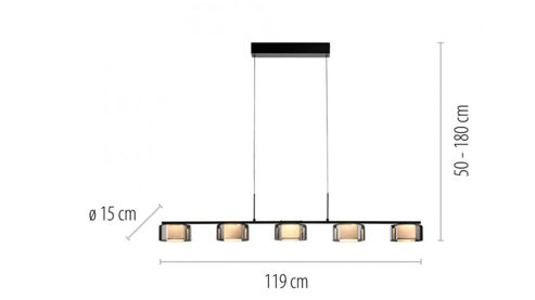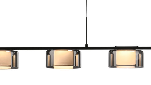 matt schwarzes Metall kombiniert mit fünf runden Lampenschirmen aus Rauchglas