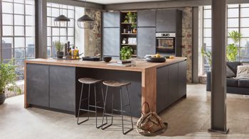 Die nobilia® Einbauküche Laser begeistert mit ihrem wilden Industrie-Look, der exzellenten Verarbeitung und der hohen Funktionalität. Sie kombiniert schwarzbetonfarbene Fronten mit Taxus-Nachbildung. Der Korpus und die Sockelblenden sind ebenfalls im speziellen Schwarzbetonton gestaltet, während die Arbeitsplatten und Sichtseiten die warme Taxusnuance aufgreifen. Akzentuierend wirkt die grifflose Frontgestaltung.