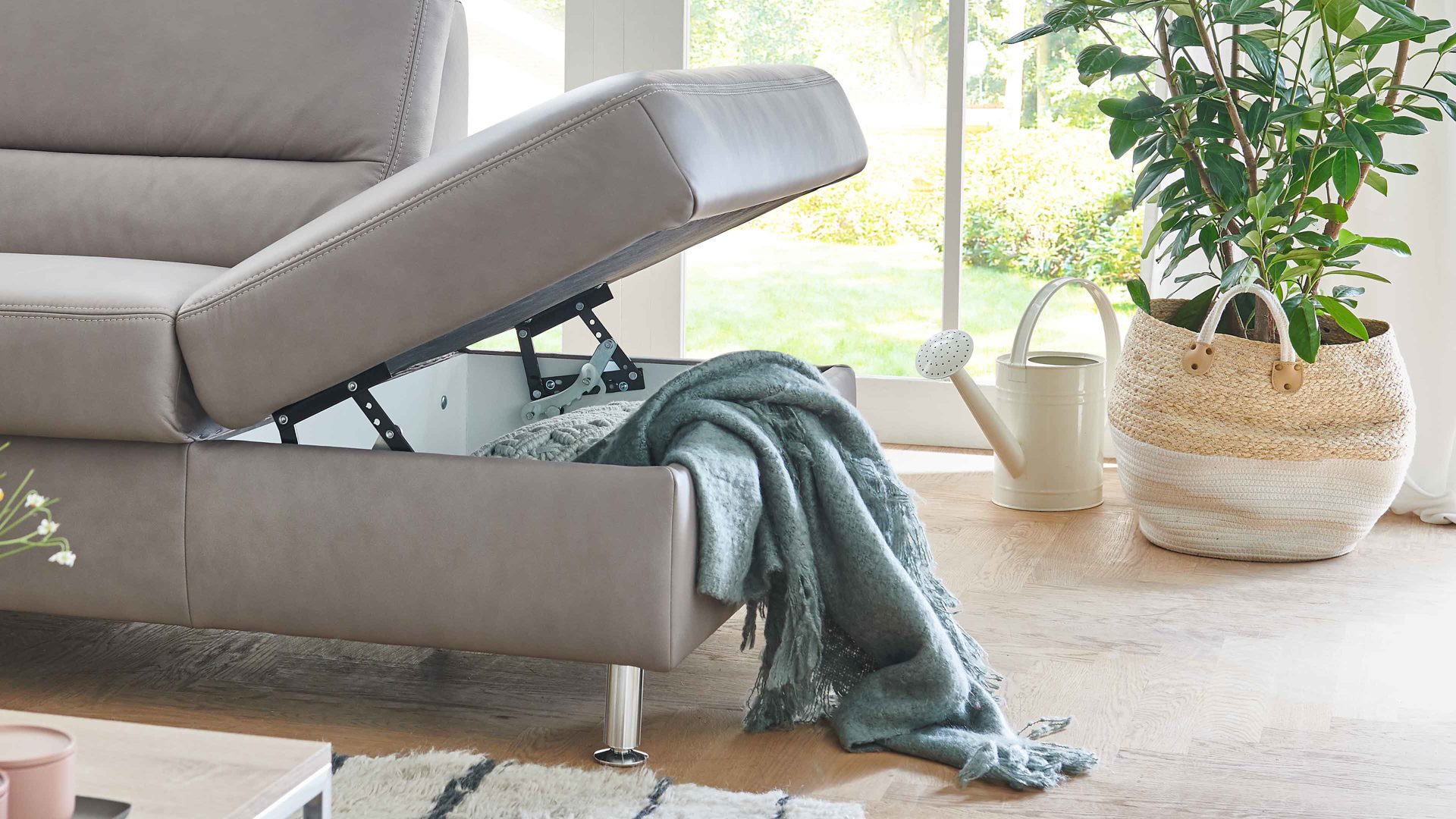 Das Sofaelement lässt sich mittels Rasterbeschlag in mehreren Stufen öffnen. Dabei kommt innen weiß beschichteter und belüfteter Stauraum zum Vorschein. Dieser eignet sich beispielsweise zum Verstauen von Wohntextilien und Spielzeug.